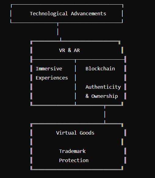 The above diagram outlines the relationship between various elements of technological advancement on VR and AR, blockchain and the implication for virtual goods and trademark protection.